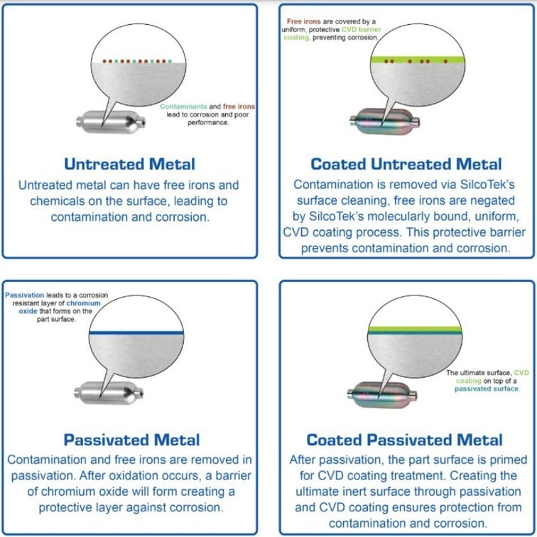 Advanced chemical vapor deposition coatings, such as those developed by SilcoTek, build upon the concept of passivation by creating an ultra thin, inert barrier layer over the stainless steel surface.