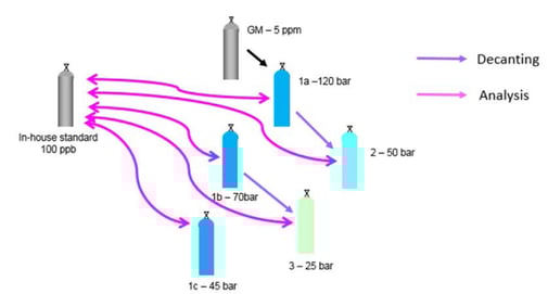 The study noted the following test parameters: "The first part of the research consisted of quantitatively studying the adsorption of VOC at trace levels for a selection of different aluminum and stainless steel pressurized cylinders having proprietary passivation treatments. A batch of gas mixtures containing several OVOCs, including methanol, ethanol and acetone, at 100 nmol/mol, a batch containing formaldehyde (F) at 1 µmol/mol and a batch containing several monoterpenes (MT) at 2 nmol/mol have been prepared using state-of-the-art gravimetric preparation methods (ISO 6142-1)." The report diagrammed the decanting and analysis below.*