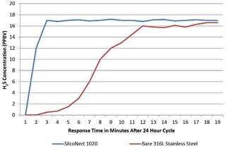 SilcoNert® coated flowpaths improve response by 10x by preventing surface interaction of reactive stainless steel with active compounds like H2S. Comparative response curves show a dramatic increase in response when using SilcoNert coated flowpaths; reducing cal times and improving sensitivity and reliability of results.*